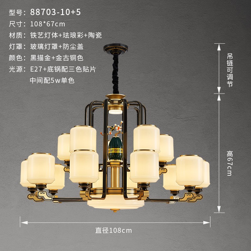 | 颜色材质 | 黑描金+金古铜色,铁艺灯体+珐琅彩+陶瓷 玻璃灯罩+防尘盖 |