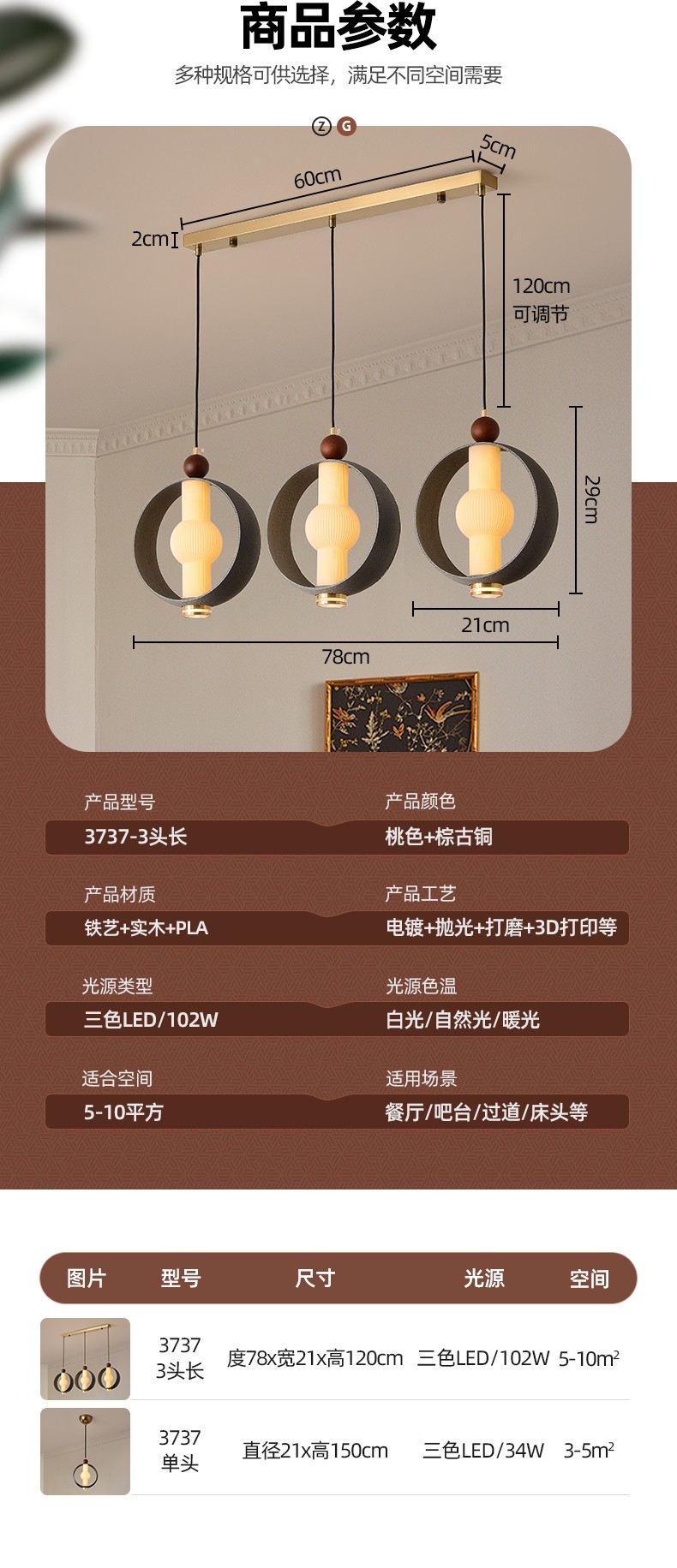 | 颜色材质 | 棕古铜+桃色,铁艺+实木+PLA |
