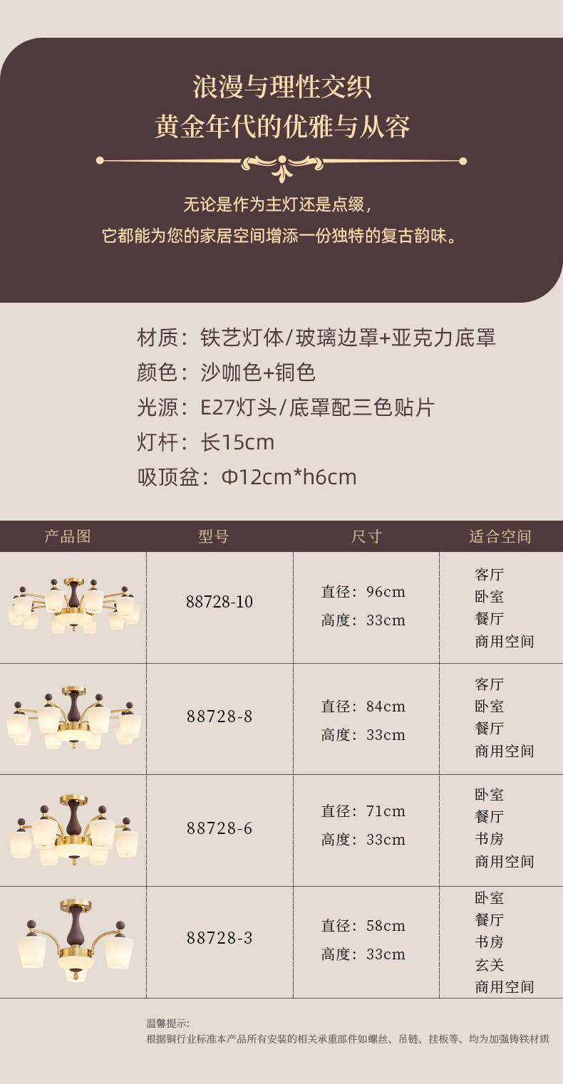 | 颜色材质 | 沙咖色+铜色, 铁艺灯体+玻璃边罩+亚克力底罩 |