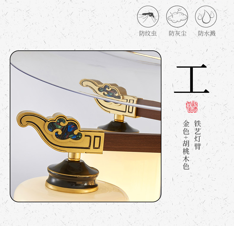 | 颜色材质 | 金色+胡桃木色,铁艺灯体+玻璃灯罩 |