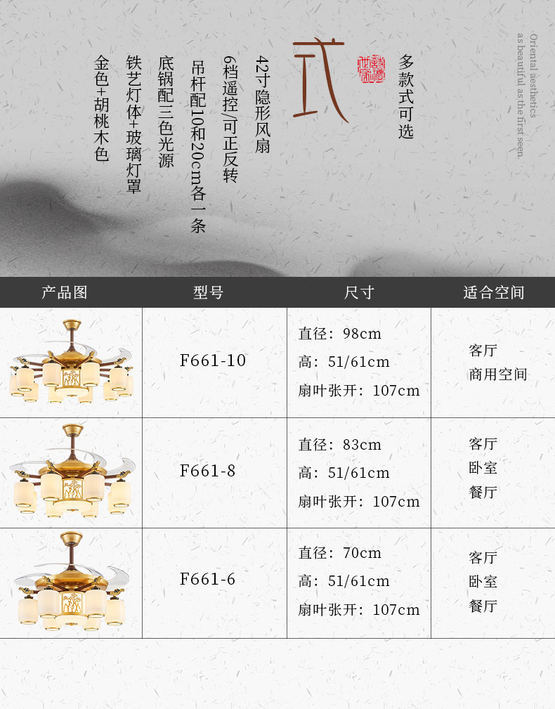 | 规格 | 直径:700mm 高:510/610mm 扇叶张开1070mm,E27 |