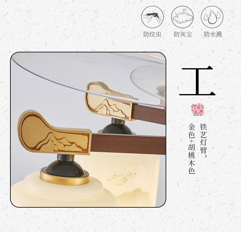 | 颜色材质 | 金色+胡桃木色,铁艺灯体+玻璃灯罩 |