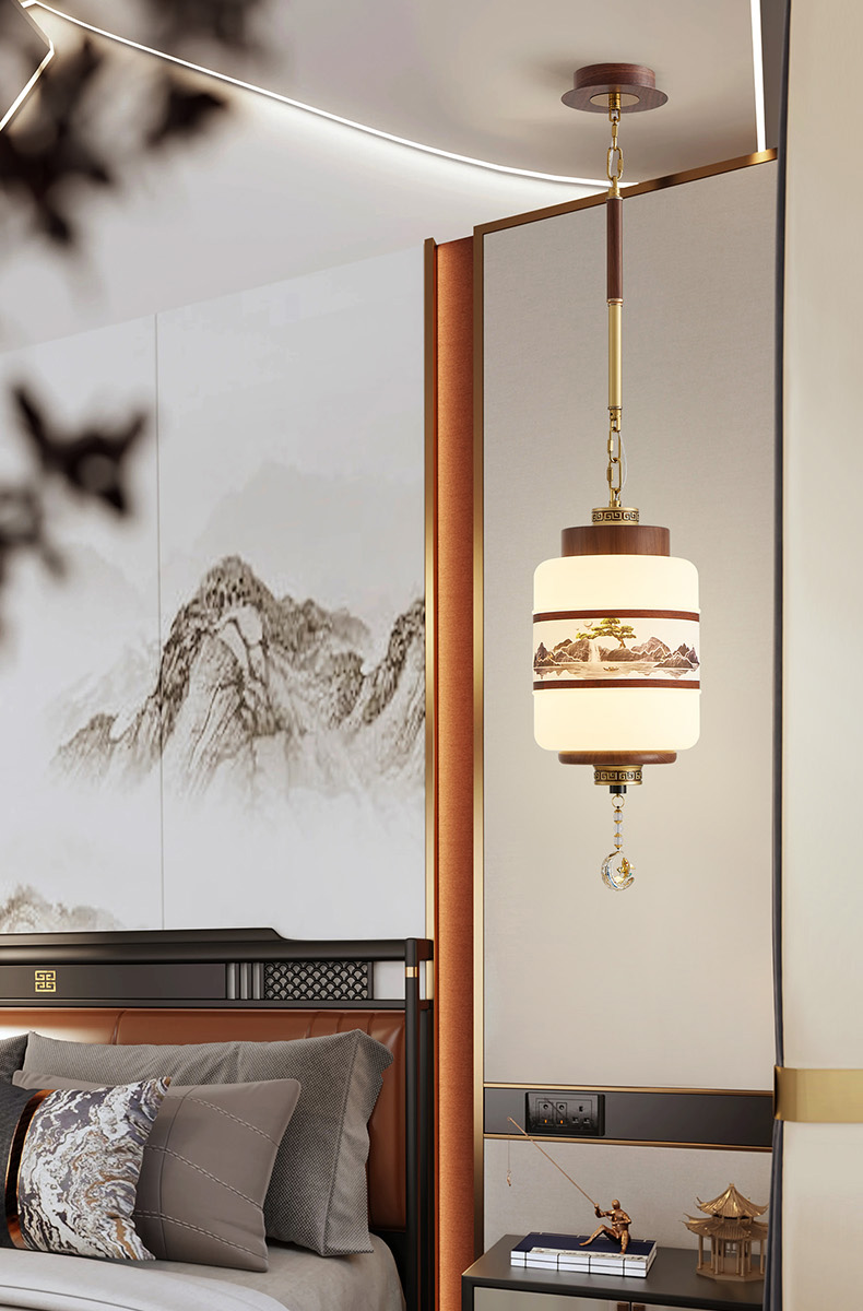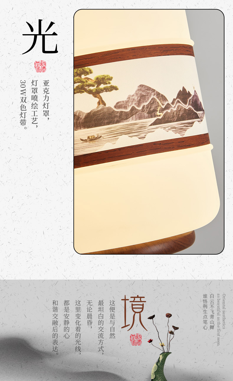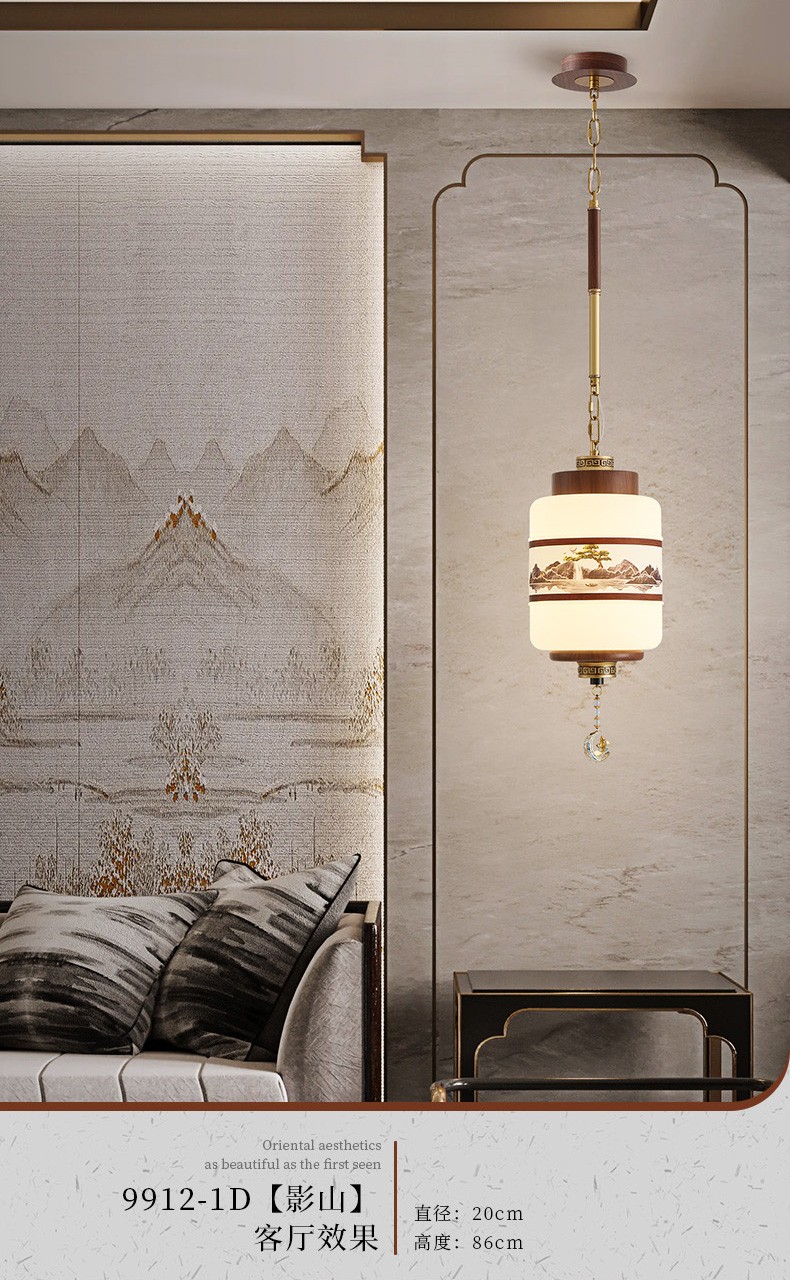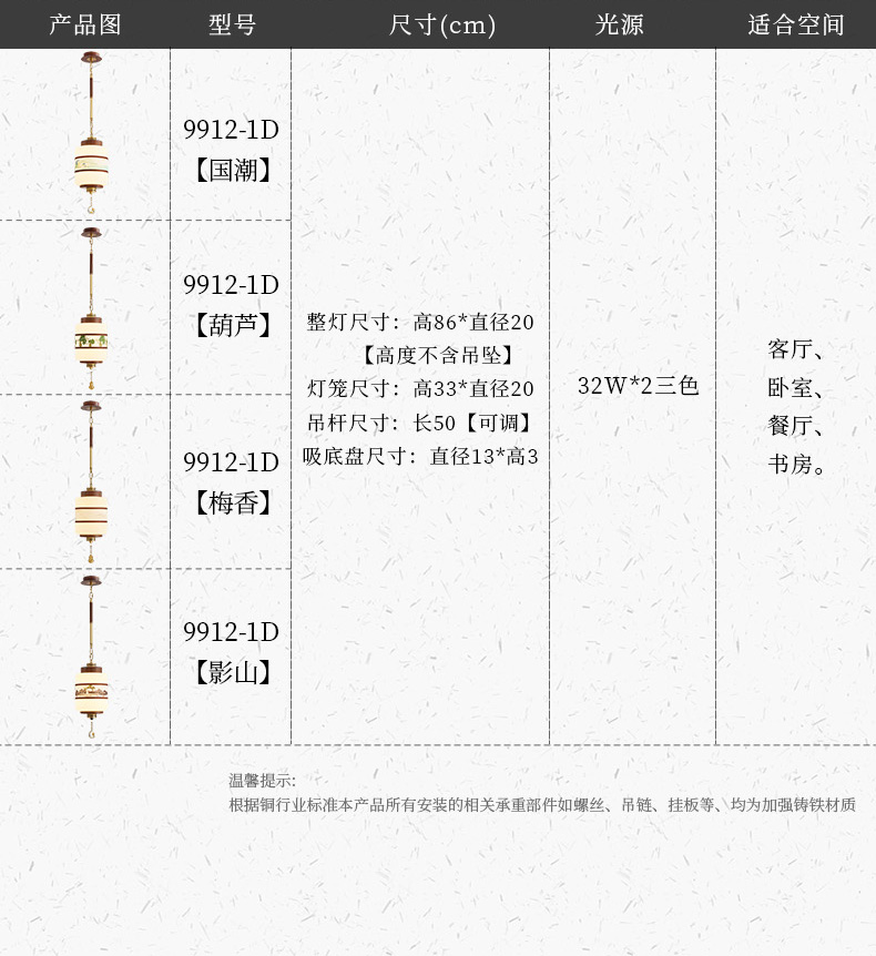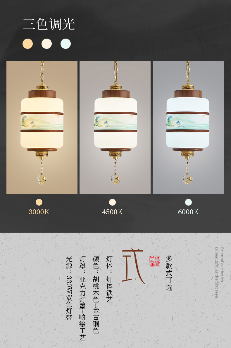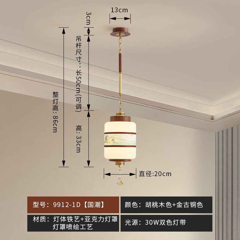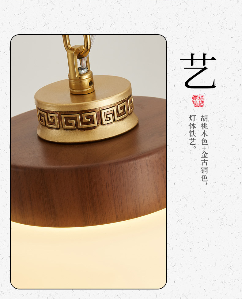 | 颜色材质 | 胡桃木色+金古铜色,灯体铁艺+亚克力灯罩 |