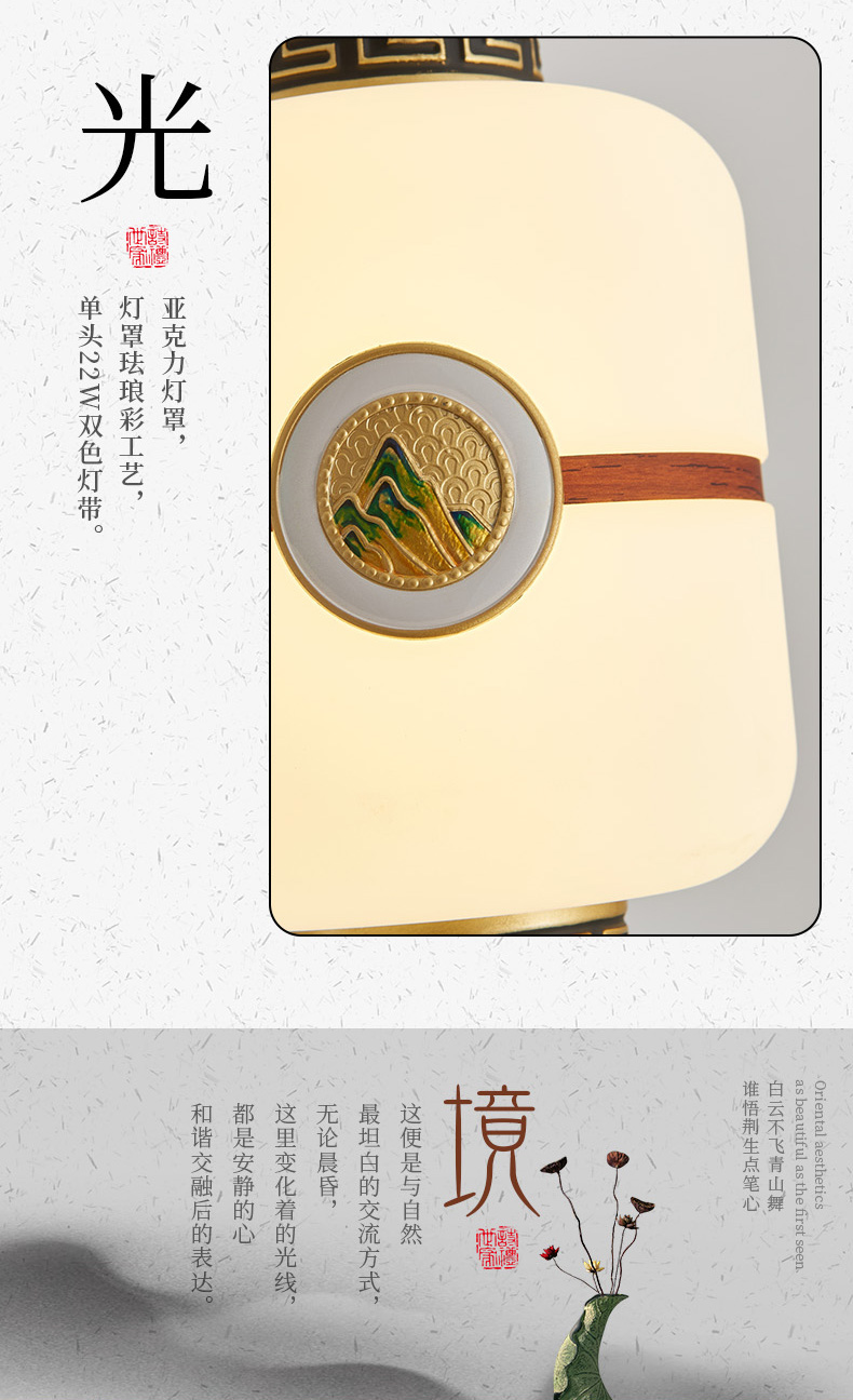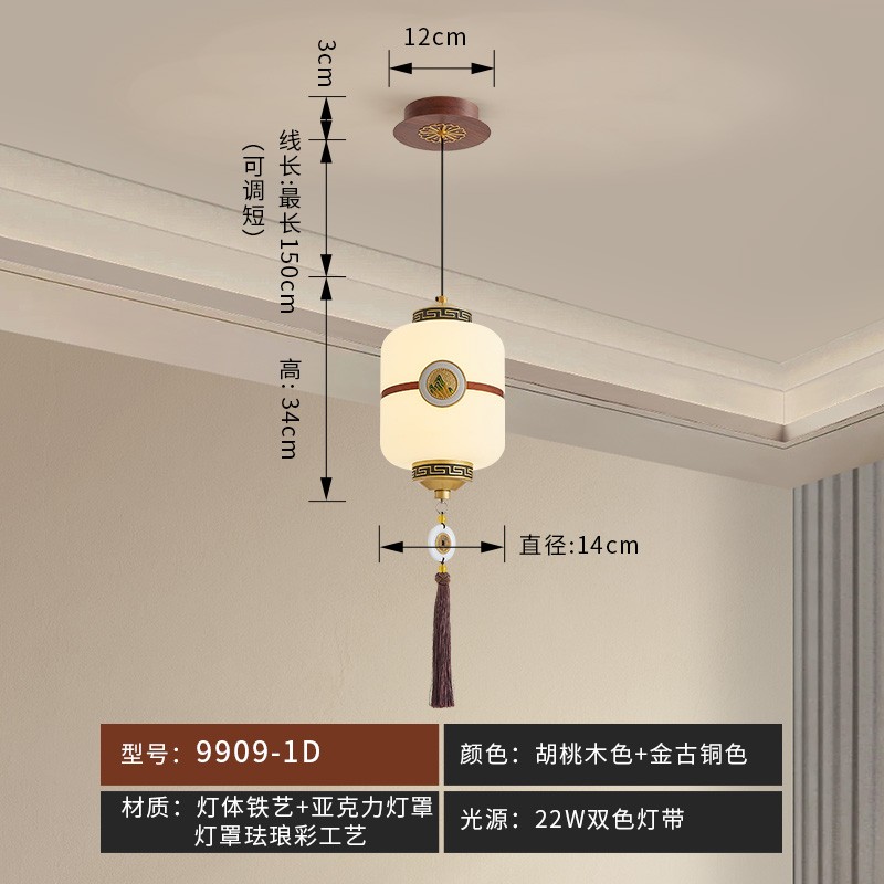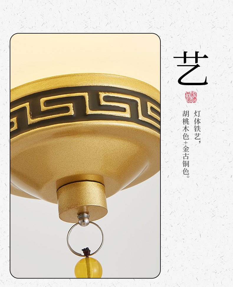 | 颜色材质 | 胡桃木色+金古铜色,灯体铁艺+亚克力灯罩 |