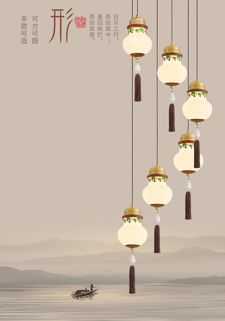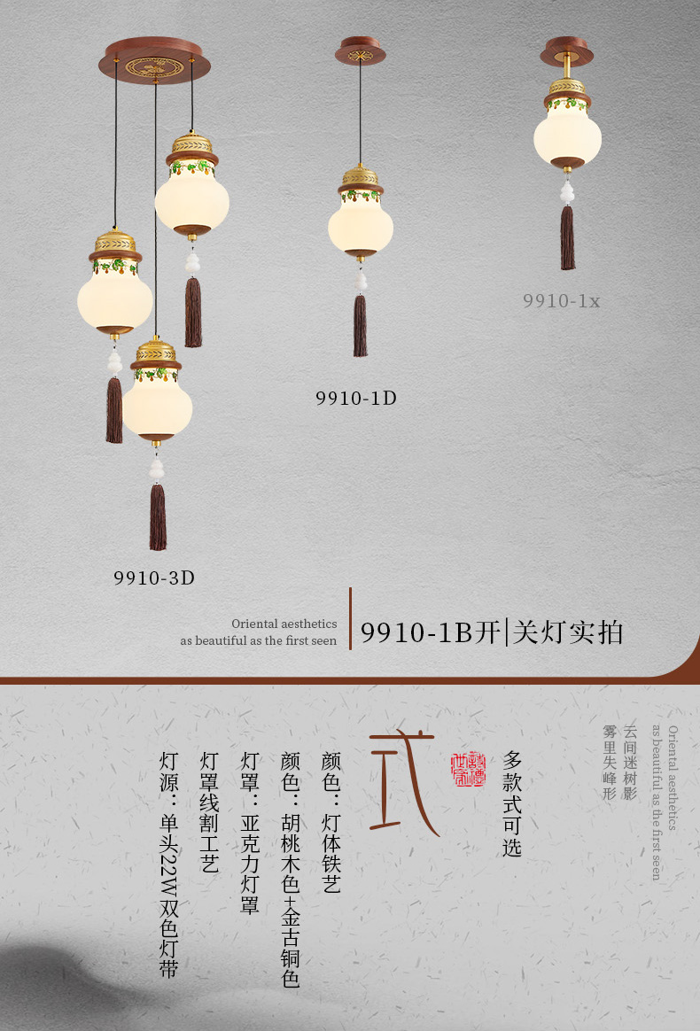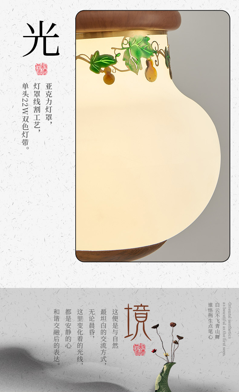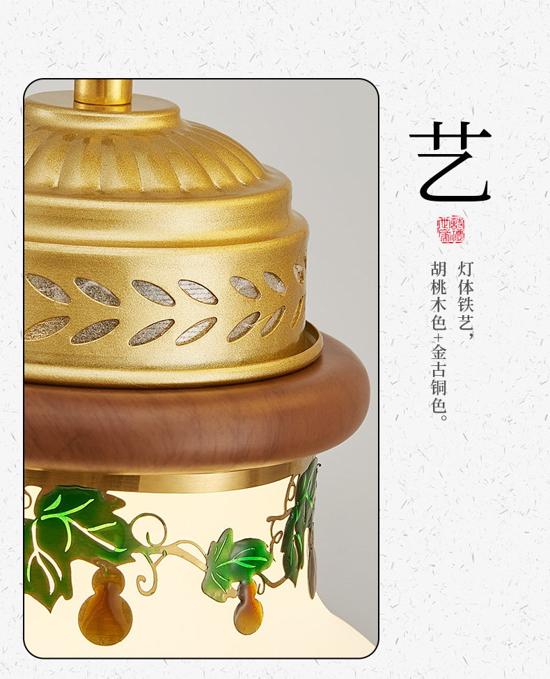 | 颜色材质 | 胡桃木色+金古铜色,灯体铁艺+亚克力灯罩 |