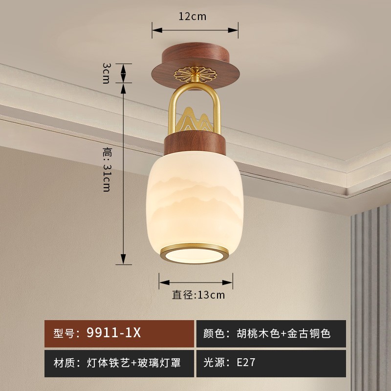 | 颜色材质 | 胡桃木色+金古铜色,灯体铁艺+玻璃灯罩 |