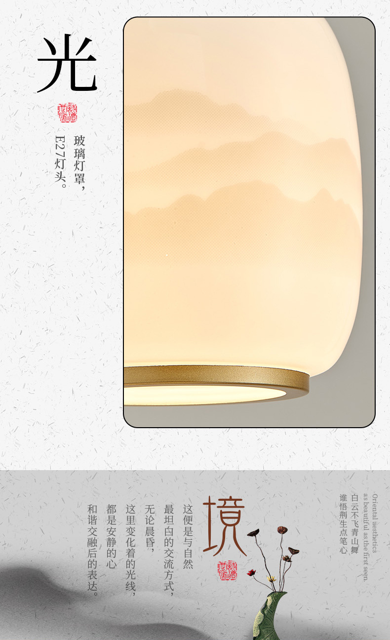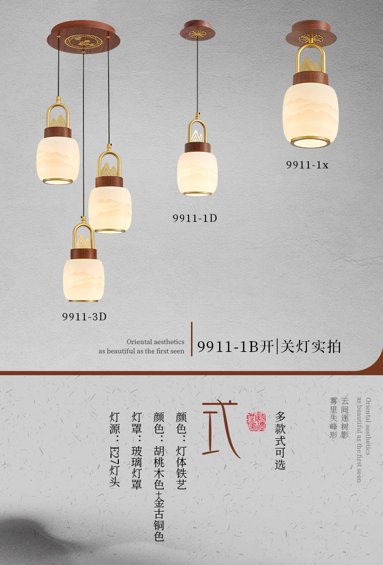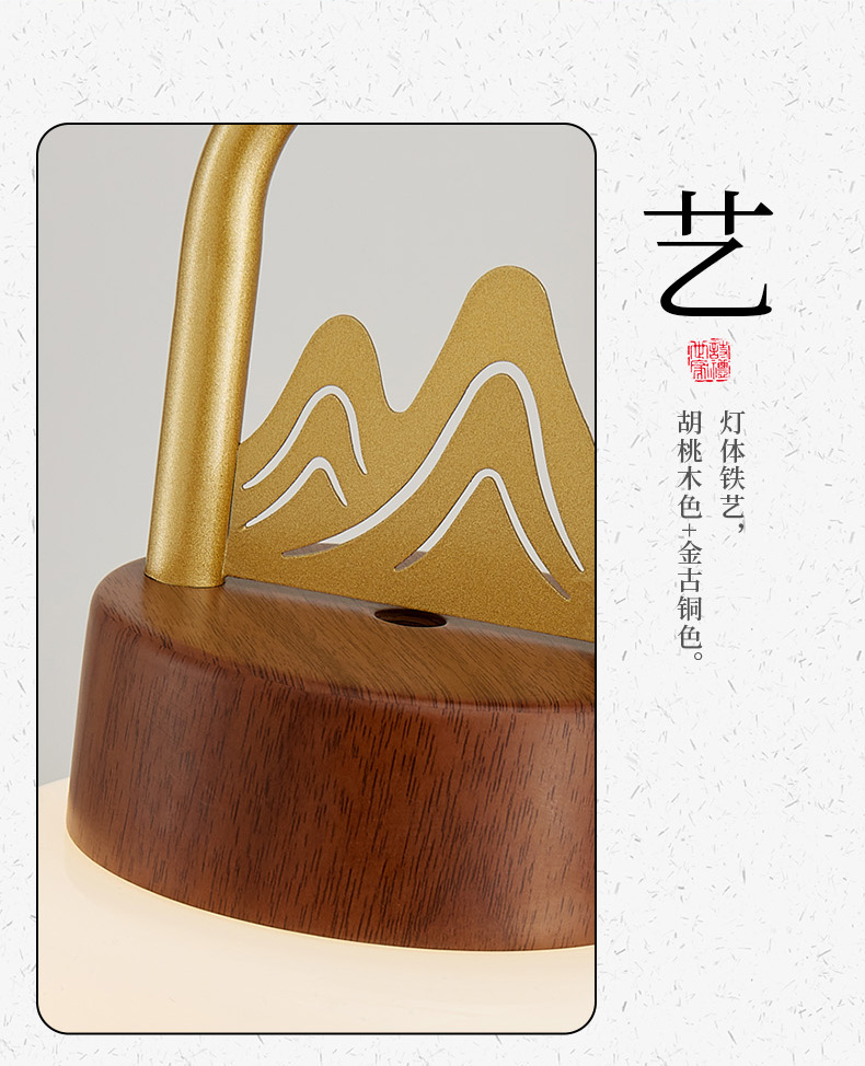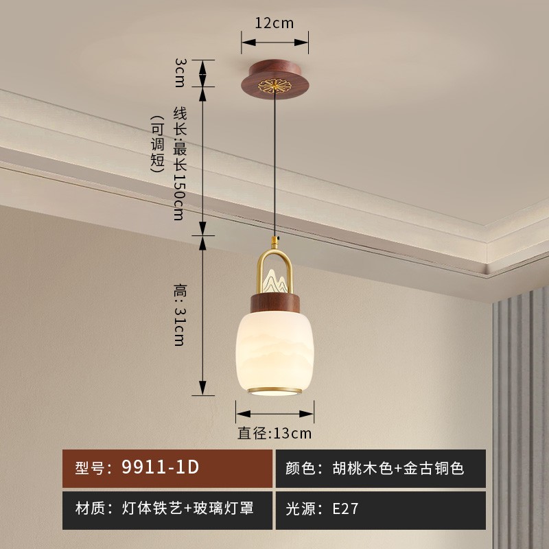 | 颜色材质 | 胡桃木色+金古铜色,灯体铁艺+玻璃灯罩 |