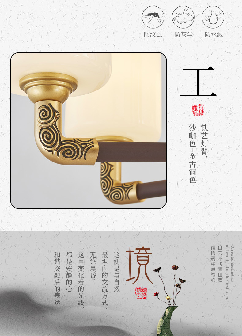 | 颜色材质 | 沙咖色+金古铜色,铁艺灯臂+玻璃灯罩+防尘盖 |