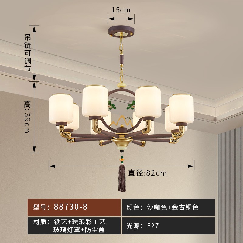 | 颜色材质 | 沙咖色+金古铜色,铁艺+珐琅彩工艺+玻璃灯罩+防尘盖 |