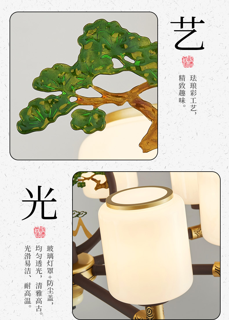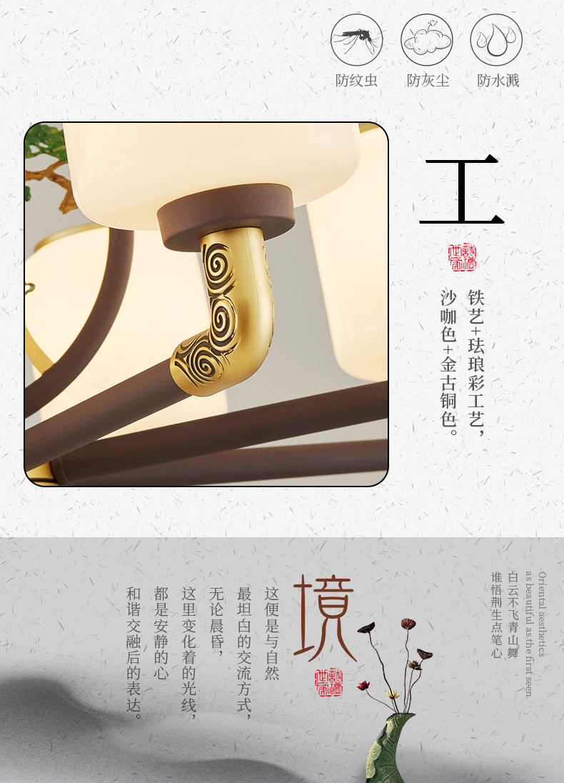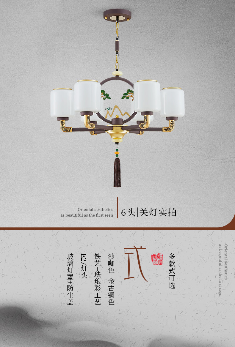 | 颜色材质 | 沙咖色+金古铜色,铁艺+珐琅彩工艺+玻璃灯罩+防尘盖 |