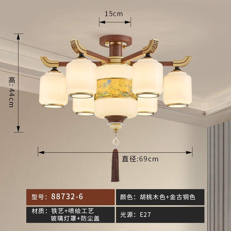 | 颜色材质 | 胡桃木色+金古铜色,铁艺+喷绘工艺+玻璃灯罩 |