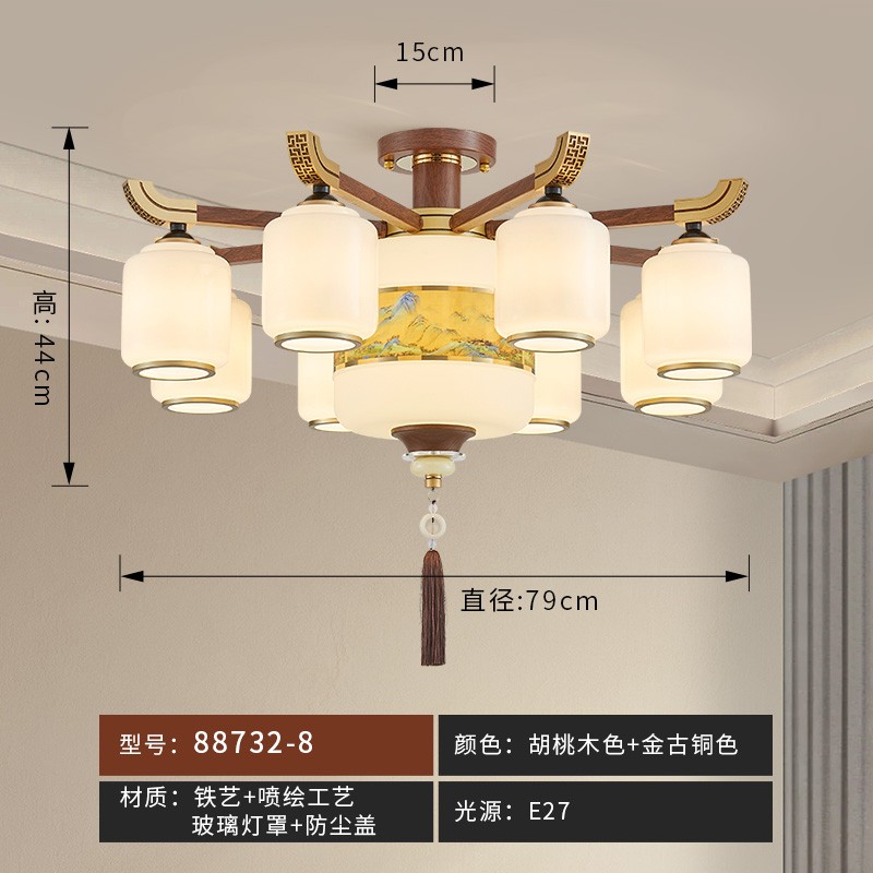 | 颜色材质 | 胡桃木色+金古铜色,铁艺+喷绘工艺+玻璃灯罩 |