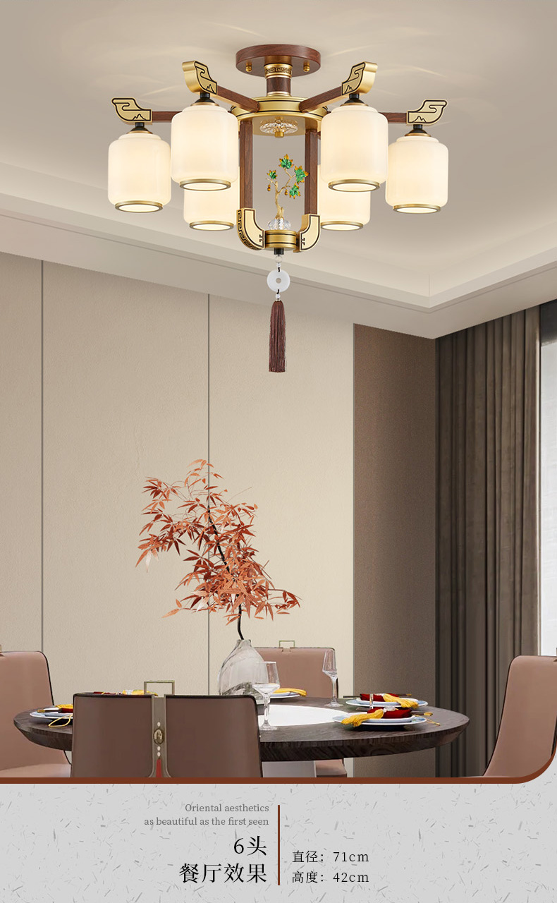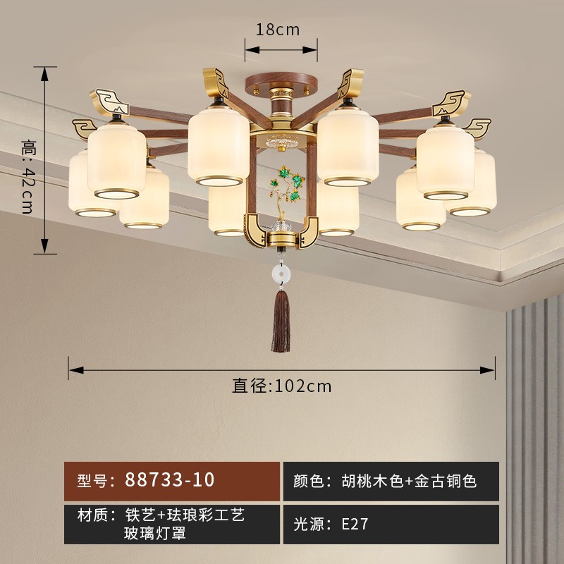 | 颜色材质 | 胡桃木色+金古铜色,铁艺+珐琅彩工艺+玻璃灯罩 |
