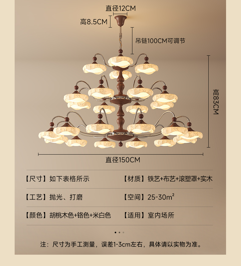| 颜色材质 | 胡桃木色+铬色+米白色,铁艺+布艺+滚塑罩+实木 |