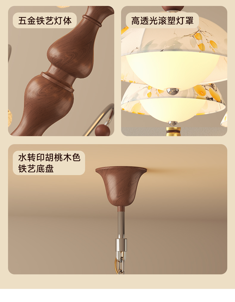 | 颜色材质 | 胡桃木色+咖啡色+铬色,铁艺+双层布艺+滚塑罩+实木圆球 |