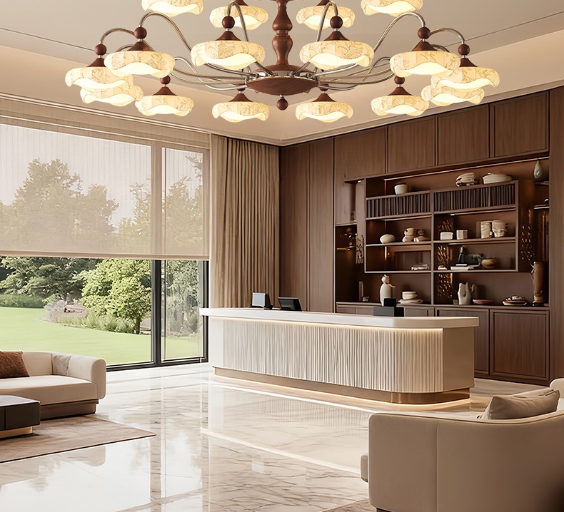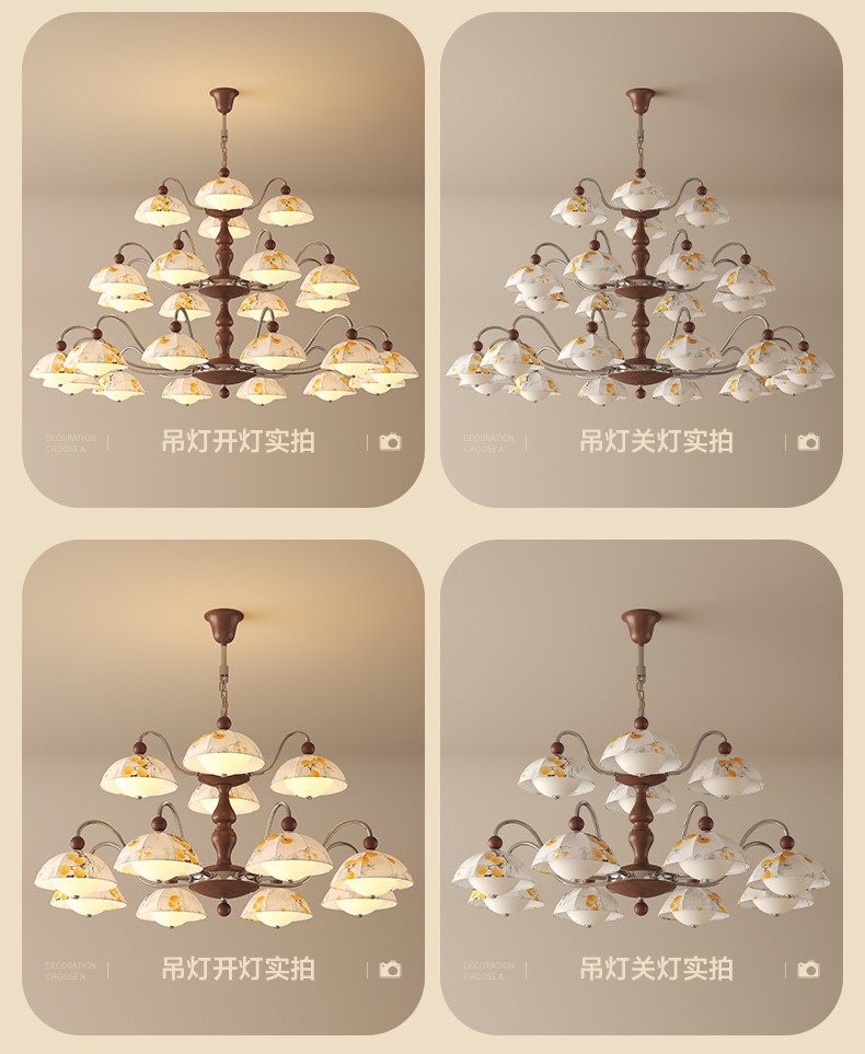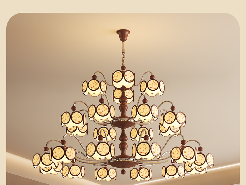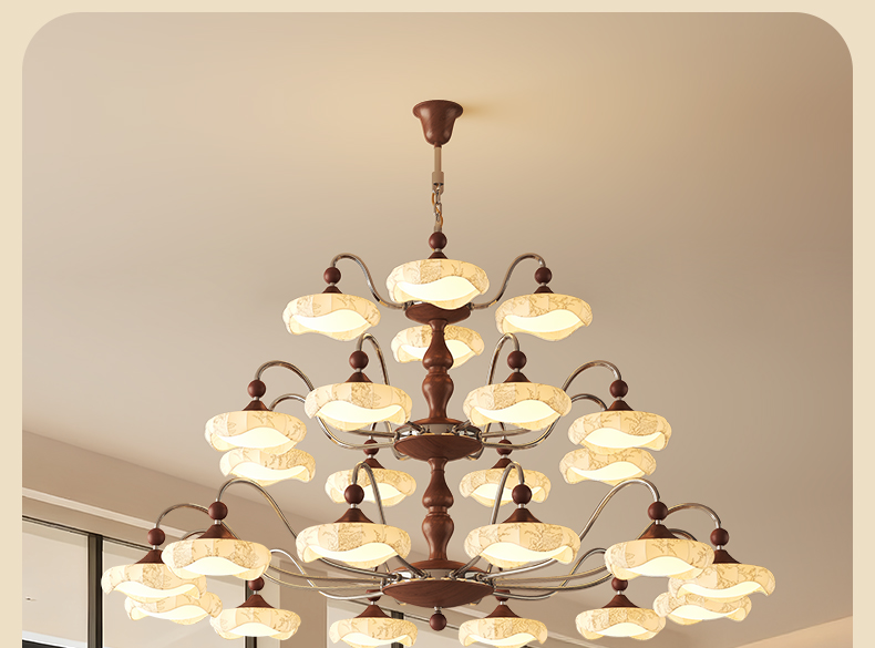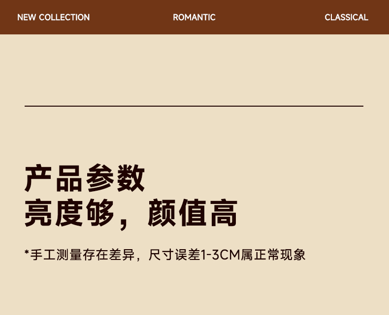 | 颜色材质 | 胡桃木色+铬色+米黄色,铁艺+布艺+滚塑罩+实木圆球 |