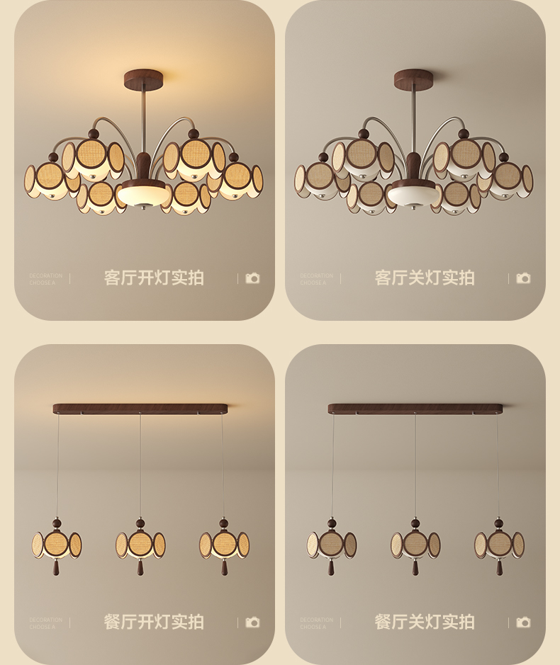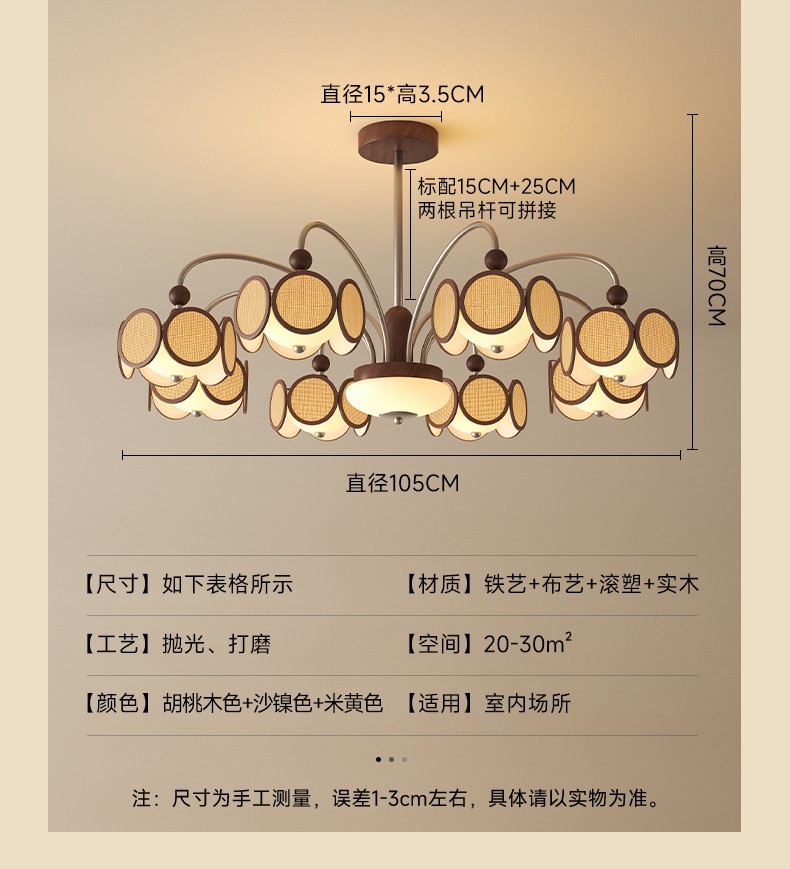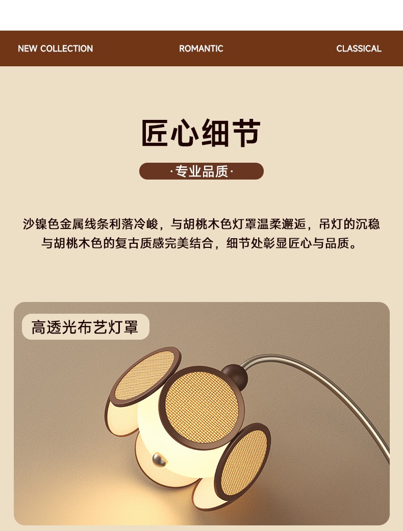 | 颜色材质 | 胡桃木色+沙镍色+米黄色,铁艺+布艺+滚塑罩+实木 |
