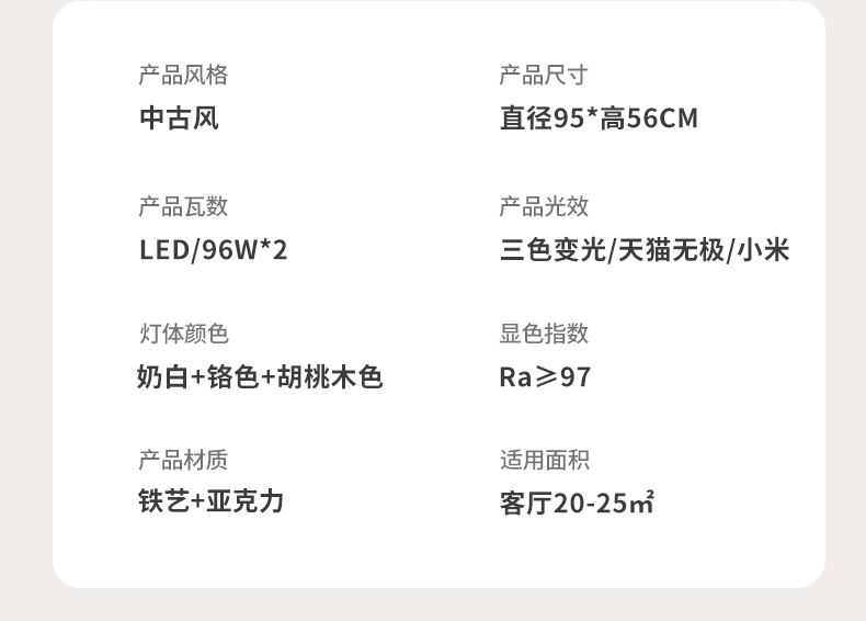 | 颜色材质 | 奶白+铬色+胡桃木色,铁艺+亚克力 |