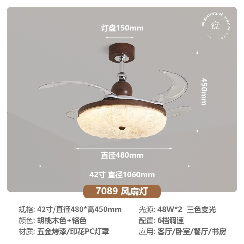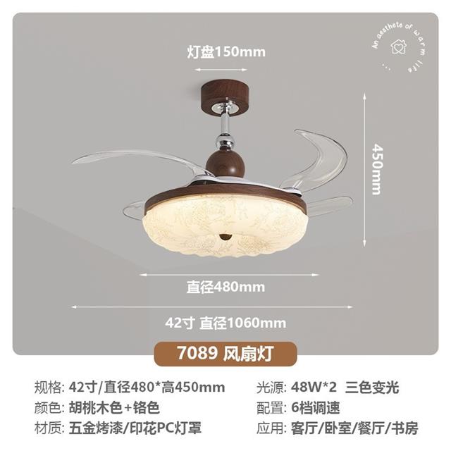 | 颜色材质 | 胡桃木色+铬色,五金烤漆,印花PC灯罩,42寸6档3色变光,灯盘150MM |