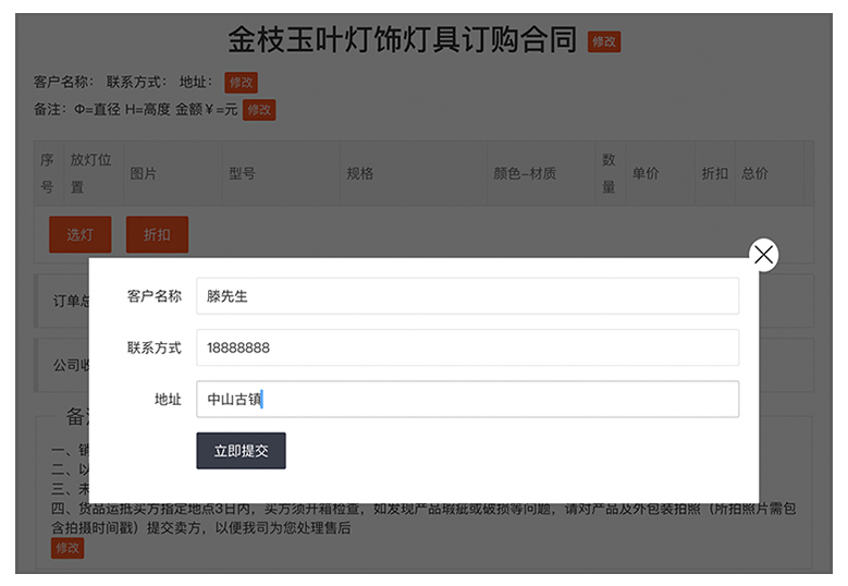 编辑客户信息时,直接输入客户地点的详细地址(省市区XX路XX号),也可以输入地点的名称(X公园X大楼)以及电话号码,马上就在订单上显示。(点击修改)编辑订单灯具信息与金额时,可直接输入修改。